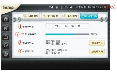 ![]() ① 현재 사용중인 펌웨어 버전 표시 ② 사용중인 SD카드의 사용량 표시 ③ 소프트웨어 업그레이드 시에 사용 ④ 모든 설정을 출고시의 초기값으로 환원 ⑤ 설정된 값을 저장하고 메인 메뉴로 이동 [소프트웨어 업그레이드 방법] a. 업그레이드 할 소프트웨어 파일을 다운 받아 SD카드의 루트 디렉토리에 저장합니다. b. SD카드를 제품에 넣고, 환경 설정의 업그레이드를 누릅니다. c. 시스템이 자동으로 꺼졌다 켜지면서 업그레이드를 실행합니다. d. 화면에 업그레이드의 상태 안내에 따라서 업그레이드를 완료합니다. ※ 참고 사항 ▪ 업그레이드 도중에는 SD카드를 제품에서 빼거나 전원이 절대 꺼지지 않도록 주의하십시오. ▪ 업그레이드가 완료되면 사용하시던 모든 설정이 초기화 됩니다. ▪ SD카드의 ‘MAPPY’ 폴더는 내비게이션 사용시 필요하므로 삭제, 변경되지 않도록 유의하십시오. |